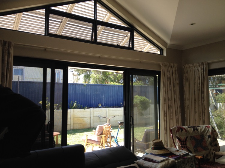 Solar pergola has slats fixed at 35degrees for winter sun but summer shade