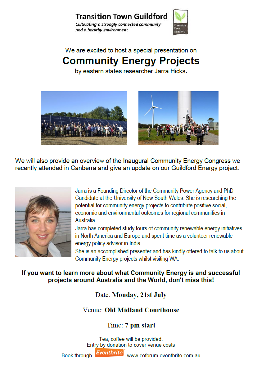 On Monday night we held a Community Energy Forum in Midland. It was short notice, but great to have the opportunity to hear from visiting Community Energy researcher Jarra Hicks. She outlined some of the inspiring community energy projects she’s visited around the world.