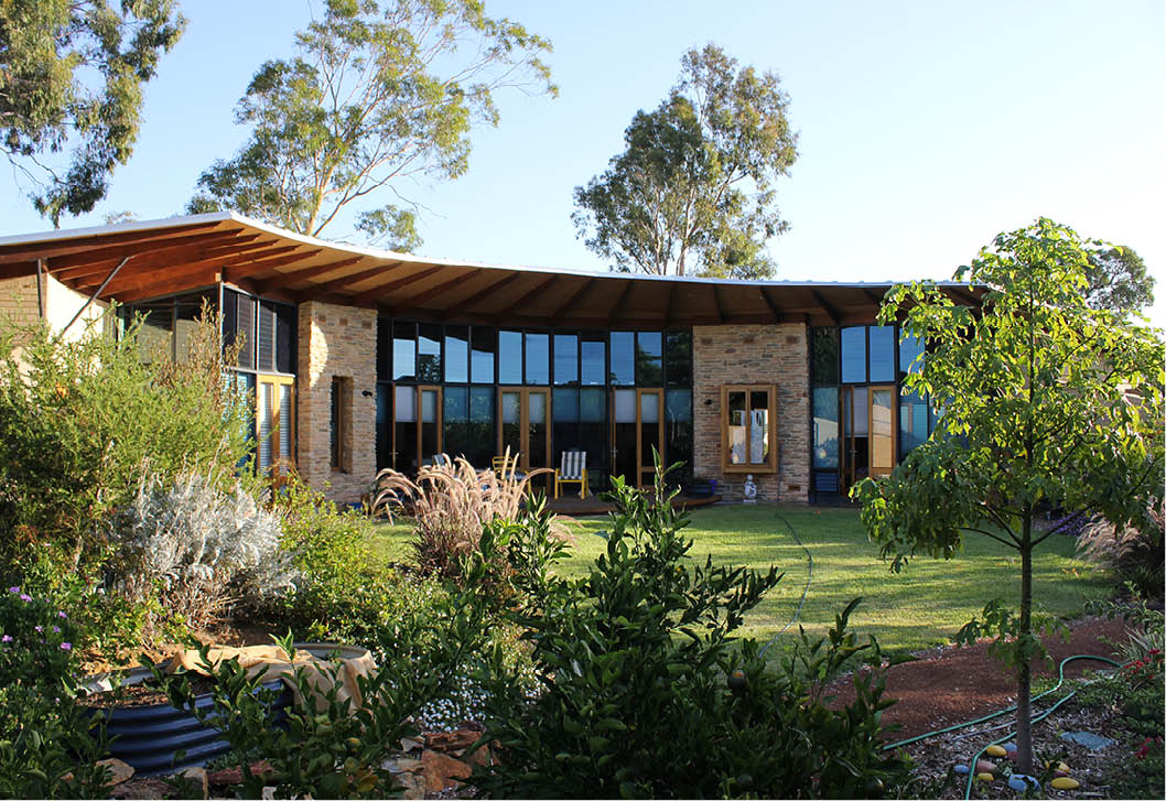 “Sitting on a 1-acre property at the edge of Mundaring townsite, this house is a sophisticated response to its setting. It was designed as our family home and I have recently launched my design business Edgefield Projects (www.edgefieldprojects.com.au). The building forms a simple L-shape in plan, with a 2m wide Jarrah deck verandah running along the inside edge, focusing the house onto the social hub: a central terrace and lawn area. The living spaces are laid out within one large volume that is bookended by a sophisticated natural oak kitchen on one end and a recycled brick fireplace (with pellet stove insert) on the other.”